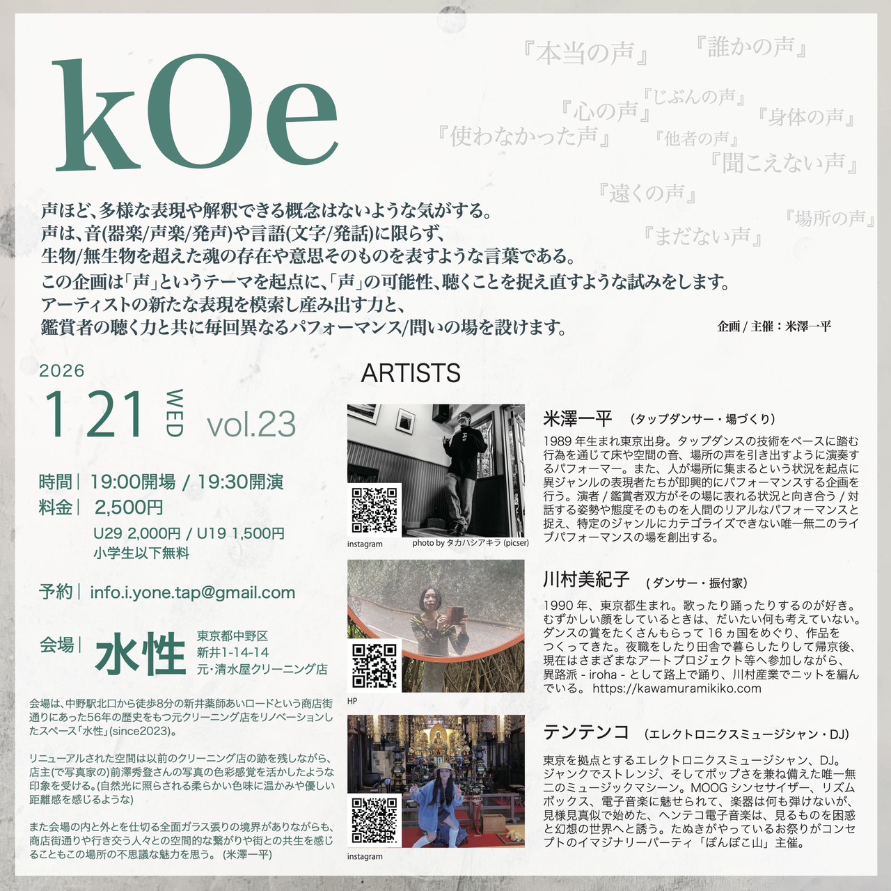 この企画は「声」というテーマを起点に、「声」の可能性/聴くことを捉え直すような試みをします。アーティストの新たな表現を模索し産み出す力と、鑑賞者の聴く力と共に毎回異なるパフォーマンス/問いの場を設けます。